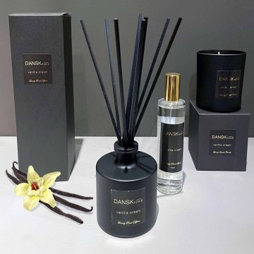Luxury Reed Diffuser 200ml—A fresh white glass vessel filled with a 100% natural, alcohol-free liquid made entirely with plant materials and certified for vegetarians. Its green credentials not only produce a long-lasting fragrance but include a low carbon footprint and production from a renewable resource. A 200ml diffuser refill is also available.